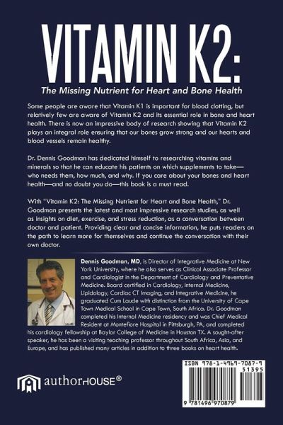 Some people are aware that Vitamin K1 is important for blood clotting, but relatively few are aware of Vitamin K2 and its essential role in bone and heart health. There is now an impressive body of research showing that Vitamin K2 plays an integral role ensuring that our bones grow strong and our hearts and blood vessels remain healthy. Dr. Dennis Goodman has dedicated himself to researching vitamins and minerals so that he can educate his patients on which supplements to take-who needs them, how much, and why. If you care about your bones and heart health-and no doubt you do-this book is a must read. With "Vitamin K2: The Missing Nutrient for Heart and Bone Health," Dr. Goodman presents the latest and most impressive research studies, as well as insights on diet, exercise, and stress reduction, as a conversation between doctor and patient. Providing clear and concise information, he puts readers on the path to learn more for themselves and continue the conversation with their own doctor.