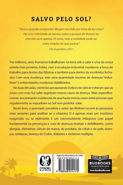 ¿Teria o grande compositor Mozart morrido por falta de luz solar? Há uma infinidade de teorias sobre o porquê de Mozart ter morrido com apenas 35 anos, mas a realidade pode ser mais simples do que parece¿. The Guardian, 2011. Por milênios, seres humanos trabalharam em campos e terras sob o calor e a luz de nossa estrela mais próxima. Então, com a revolução industrial nós mudamos a força de trabalho para dentro das fábricas e também para dentro de escritórios fechados. Com essa mudança veio uma quantidade enorme de doenças ¿industriais¿ e enfermidades modernas debilitantes. Há duas décadas, cientistas pesquisando índices de câncer, notaram que as áreas que possuíam mais luz solar tinham menores níveis de ocorrência da doença. Mais especificamente, eles encontraram evidências de que havia muito menos casos entre pessoas que regularmente se expunham ao sol sem protetor solar. Nesse livro, o premiado jornalista e autor Ian Wishart investiga a pesquisa mais recente sobre a Vitamina D para então, finalmente descobrir se a Vitamina D é apenas mais um modismo exagerado ou se ela realmente é a vitamina milagrosa que possui um papel fundamental para prevenção e cura das doenças mais mortais e debilitantes do planeta. Asma, alergias, autismo, Alzheimer, câncer de mama, câncer de próstata, câncer de cólon, câncer de pele, doenças cardíacas, derrames, resfriados, gripes, doença de Crohn, doenças mentais, diabetes, tuberculose, esclerose múltipla, infertilidade, infecções por superbactérias, entre outros.