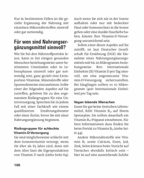 In diesem Buch lernen Sie die einzelnen Mikronährstoffe mit ihren individuellen Funktionen und Besonderheiten anhand eines Steckbriefs näher kennen. Außerdem sind in dem Gesundheitsratgeber zu jedem Nährstoff ausgewählte Lebensmittel mit hohem Gehalt und Referenzwerte für die Nährstoffzufuhr, welche die DGE herausgegeben hat, aufgeführt.