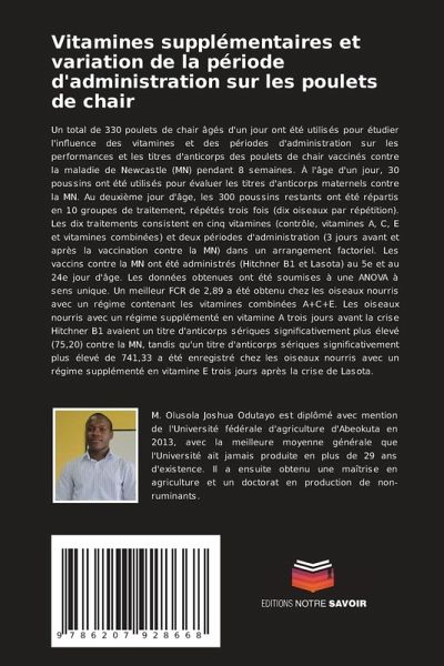 Un total de 330 poulets de chair âgés d'un jour ont été utilisés pour étudier l'influence des vitamines et des périodes d'administration sur les performances et les titres d'anticorps des poulets de chair vaccinés contre la maladie de Newcastle (MN) pendant 8 semaines. À l'âge d'un jour, 30 poussins ont été utilisés pour évaluer les titres d'anticorps maternels contre la MN. Au deuxième jour d'âge, les 300 poussins restants ont été répartis en 10 groupes de traitement, répétés trois fois (dix oiseaux par répétition). Les dix traitements consistent en cinq vitamines (contrôle, vitamines A, C, E et vitamines combinées) et deux périodes d'administration (3 jours avant et après la vaccination contre la MN) dans un arrangement factoriel. Les vaccins contre la MN ont été administrés (Hitchner B1 et Lasota) au 5e et au 24e jour d'âge. Les données obtenues ont été soumises à une ANOVA à sens unique. Un meilleur FCR de 2,89 a été obtenu chez les oiseaux nourris avec un régime contenant les vitamines combinées A+C+E. Les oiseaux nourris avec un régime supplémenté en vitamine A trois jours avant la crise Hitchner B1 avaient un titre d'anticorps sériques significativement plus élevé (75,20) contre la MN, tandis qu'un titre d'anticorps sériques significativement plus élevé de 741,33 a été enregistré chez les oiseaux nourris avec un régime supplémenté en vitamine E trois jours après la crise de Lasota.
