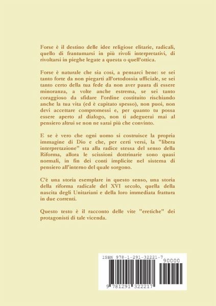 Forse è il destino delle idee religiose quello di frantumarsi in più rivoli interpretativi. Forse è naturale che sia così: se è vero che ogni uomo si costruisce la propria immagine di Dio e che, per certi versi, la "libera interpretazione" sta alla radice stessa del senso della Riforma, allora le scissioni dottrinarie sono quasi normali, in fin dei conti implicite nel sistema di pensiero all'interno del quale sorgono. C'è una storia esemplare in questo senso, una storia della riforma radicale del XVI secolo, quella della nascita degli Unitariani e della loro immediata frattura in due correnti. Questo testo racconta le vite "eretiche" dei protagonisti di quella vicenda.