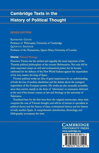Francisco Vitoria was the earliest and arguably the most important of the Thomist political philosophers of the Counter-Reformation. Not only did he write important essays on civil and ecclesiastical power, but he became celebrated for his defence of the new world Indians against the imperialism of his own master, the King of Spain. Vitoria's political works are thus of great importance for an understanding both of the rise of modern absolutism, and the debate about the emergent imperialism of the European powers. His works are also unusually accessible, since they survive mainly in the form of 'relectiones', or summaries delivered at the end of his lecture courses on law and theology at the University of Salamanca. Translated here into English for the first time, these texts comprise the core of Vitoria's thought, and will be of interest to specialists in political theory and the history of ideas, ecclesiastical history, and the history of early modern Spain. A comprehensive introduction, a chronology, and a bibliography accompany the texts.