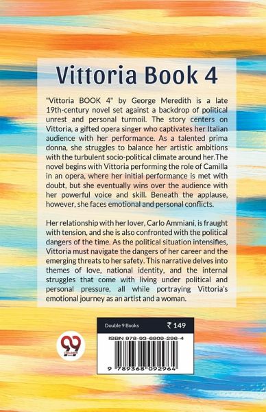""Vittoria BOOK 4"" by George Meredith is a late 19th-century novel set against a backdrop of political unrest and personal turmoil. The story centers on Vittoria, a gifted opera singer who captivates her Italian audience with her performance. As a talented prima donna, she struggles to balance her artistic ambitions with the turbulent socio-political climate around her. The novel begins with Vittoria performing the role of Camilla in an opera, where her initial performance is met with doubt, but she eventually wins over the audience with her powerful voice and skill. Beneath the applause, however, she faces emotional and personal conflicts. Her relationship with her lover, Carlo Ammiani, is fraught with tension, and she is also confronted with the political dangers of the time. As the political situation intensifies, Vittoria must navigate the dangers of her career and the emerging threats to her safety. This narrative delves into themes of love, national identity, and the internal struggles that come with living under political and personal pressure, all while portraying Vittoria's emotional journey as an artist and a woman.