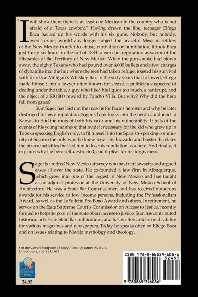 "I will show them there is at least one Mexican in the country who is not afraid of a Texas cowboy." Having drawn the line, teenager Elfego Baca backed up his words with his six guns. Nobody, but nobody, even Texans, would any longer subject the peaceful Mexican settlers of the New Mexico frontier to abuse, mutilation or humiliation. It took Baca just thirty-six hours in the fall of 1884 to earn his reputation as savior of the Hispanics of the Territory of New Mexico. When the gun-smoke had blown away, the eighty Texans who had poured over 4,000 bullets and a few charges of dynamite into the hut where the teen had taken refuge, toasted his survival with drinks at Milligan's Whiskey Bar. In the sixty years that followed, Elfego made himself into a lawyer often known for sleaze, a politician suspected of dealing under the table, a guy who liked his liquor too much, a bankrupt, and the object of a $30,000 reward by Pancho Villa. But why? Why did the hero fall from grace? Stan Sager has laid out the reasons for Baca's heroism and why he later destroyed his own reputation. Sager's book looks into the hero's childhood in Kansas to find the roots of both his valor and his vulnerability. It tells of the events of his young manhood that made it necessary for the kid who grew up in Topeka speaking English only, to fit himself into the Spanish-speaking community of Socorro the only way he knew how--by bravado and bluster. It relates the bizarre activities that led him to lose his reputation as a hero. And finally, it explains why the hero self-destructed, and it pleas for his forgiveness.