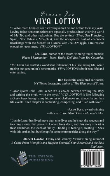 I've followed Lonnie Lazar's writings about his son Lofton for many years. ving father-son connections are especially precious in an evolving world of Me Too and other reckonings. But the settings (Tibet, San Francisco, Spain, New Orleans, Memphis), and the unexpected cast of characters (Backstage with the Stones! In a sauna with Joe DlMaggio!) are reasons enough to recommend VIVA LOFTON." -Lea Lane, author of the award-winning travel memoir, Places I Remember: 'Tales, Truths, Delights from Too Countries. -Mr. Lazar has crafted a wonderful testament of his fascinating life, while tracing our generation's benchmarks. VIVA LOFTON is both beautiful and entertaining. -Bob Eckstein, acclaimed cartoonist, .NY Times bestselling author of The Elements of Stress. "Lazar quotes John Ford: When it's a choice between writing the story and writing the myth, write the myth.' VIVA LOFTON is like following a Greek hero through a mythic series of challenges and almost larger than life events. Each chapter is captivating, compelling, and filled with love." -Anne Born, award-winning author of If You Stand Here and Local Color "Lonnie Lazar has lived more than nine lives and he's got the raucous and touching stories that prove it. Lonnie lives deep, and this story's heart is flesh and blood, the touch of family-finding it, feeling it, creating it. Seek with this seeker, but buckle up for some extreme rides along the way." -Robert Gordon, Emmy and Grammy Award winning author of It Came From Memphis and Respect Yourself Stan Records and the Soul Explosion.