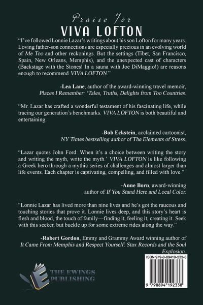 I've followed Lonnie Lazar's writings about his son Lofton for many years. ving father-son connections are especially precious in an evolving world of Me Too and other reckonings. But the settings (Tibet, San Francisco, Spain, New Orleans, Memphis), and the unexpected cast of characters (Backstage with the Stones! In a sauna with Joe DlMaggio!) are reasons enough to recommend VIVA LOFTON." -Lea Lane, author of the award-winning travel memoir, Places I Remember: 'Tales, Truths, Delights from Too Countries. -Mr. Lazar has crafted a wonderful testament of his fascinating life, while tracing our generation's benchmarks. VIVA LOFTON is both beautiful and entertaining. -Bob Eckstein, acclaimed cartoonist, .NY Times bestselling author of The Elements of Stress. "Lazar quotes John Ford: When it's a choice between writing the story and writing the myth, write the myth.' VIVA LOFTON is like following a Greek hero through a mythic series of challenges and almost larger than life events. Each chapter is captivating, compelling, and filled with love." -Anne Born, award-winning author of If You Stand Here and Local Color "Lonnie Lazar has lived more than nine lives and he's got the raucous and touching stories that prove it. Lonnie lives deep, and this story's heart is flesh and blood, the touch of family-finding it, feeling it, creating it. Seek with this seeker, but buckle up for some extreme rides along the way." -Robert Gordon, Emmy and Grammy Award winning author of It Came From Memphis and Respect Yourself Stan Records and the Soul Explosion.