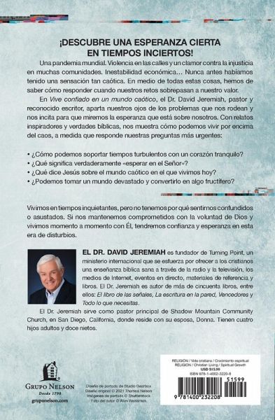 El autor best seller del New York Times, el Dr. David Jeremiah, actualiza su libro clásico, nos brinda sabiduría para el fin de los tiempos en Vive confiado en un mundo caótico Living with Confidence in a Chaotic World, que ofrece instrucciones prácticas y basadas en la Biblia para vivir una vida segura en un mundo lleno de caos y crisis. «No dejes que tu corazón esté preocupado...' La confianza puede ser difícil de conseguir en estos días. La gente está perdiendo sus trabajos, sus casas y los ahorros de toda su vida a un ritmo sin precedentes. La violencia, los desastres naturales y la depravación moral parecen estar disparándose. En medio de todo este caos, necesitamos saberlo... ¿Qué exactamente deberíamos hacer ahora? David Jeremiah trae un mensaje de esperanza y confianza del invaluable consejo de la Palabra de Dios. Responde nuestras preguntas más urgentes, que incluyen: * ¿Cómo podemos pasar esta tormenta con un corazón tranquilo? * ¿Qué significa realmente «esperar en el Señor'? * ¿Qué le está diciendo Jesús a nuestro mundo caótico de hoy? * ¿Cómo es que nos metimos en este lío? * ¿Podemos tomar un mundo quebrantado y reconstruirlo en algo fructífero? Living with Confidence in a Chaotic World New York Times bestselling author, Dr. David Jeremiah updates his classic book, presents us with endtime wisdom in Living with Confidence in a Chaotic World, offering which offers biblically based, practical instruction for living a confident life in a world filled with chaos and crisis. "Let not your heart be troubled . . ." Confidence can be hard to come by these days. People are losing their jobs, their houses, and their life savings at an unprecedented rate. Violence, natural disasters, and moral depravity seem to be skyrocketing. In the midst of all this chaos, we need to know . . . what on earth should we do now? David Jeremiah brings a message of hope and confidence from the priceless counsel of the Word of God. He answers our most urgent questions, including: * How can we weather this storm with a calm heart? * What does it truly mean to "wait on the Lord"? * What is Jesus saying to our chaotic world today? * How on earth did we get into this mess? * Can we take a broken world and rebuild it into something fruitful?
