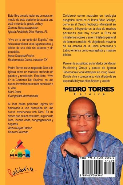 Este libro amado lector es un oasis en medio de este desierto de apatía que está viviendo la iglesia de hoy. Sammy Mosquera pastor: Iglesia Pueblo de Dios Naples, FL "Vive en la corriente del Espíritu" nos reta a abandonar esos lugares secos y áridos de una vida sin sabores y sin propósito. Isaac Sauceda Pastor: Restauración Divina, Houston TX Pedro Torres es un regalo de Dios a la Iglesia como un maestro profundo en palabra y revelación. Este libro: "Vive En la Corriente Del Espíritu" es una buena inversión para traer bendición a tu vida. Mark Drost Evangelista Internacional Al leer estas palabras logras ser empujado a una búsqueda de una nueva experiencia con Dios. Es mi deseo que al leer este libro, la gloria de Dios, inunde vidas, congregaciones y hogares. Álvaro Rojas Pastor: Denver Colorado Colaboró como maestro en teología exegética, tanto en el Texas Bible Collage, como en el Centro Teológico Ministerial en Houston, influyendo en la vida de muchas personas que hoy sirven a Dios en ministerios locales y en el ministerio pastoral de tiempo completo. Ha viajado a la mayoría de los estados de la Unión Americana y Latino América como evangelista y maestro bíblico. Pero en la actualidad es fundador de Mactor Publishing Group y pastor de Iglesia Tabernáculo Vida Metroplex en Irving Texas. Donde Vive y comparte su vida al lado de su esposa Mitzi y sus hijos Bryann y Josiah. Pedro Torres Pereira