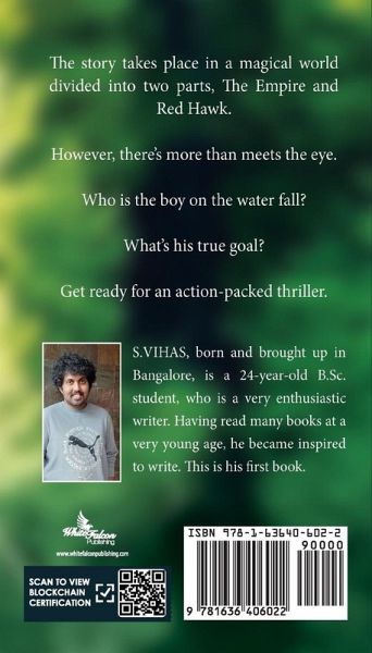 The story takes place in a magical world divided into two parts, The Empire and Red Hawk. However, there's more than meets the eye. Who is the boy on the waterfall? What's his true goal? Get ready for an action packed thriller. About the Author: S.VIHAS, born and brought up in Bangalore, is a 24 year old B.Sc. student, who is a very enthusiastic writer. Having read many books at a very young age, he became inspired to write. This is his first book.