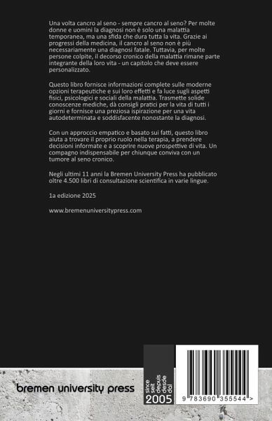 Una volta cancro al seno - sempre cancro al seno? Per molte donne e uomini la diagnosi non è solo una malattia temporanea, ma una sfida che dura tutta la vita. Grazie ai progressi della medicina, il cancro al seno non è più necessariamente una diagnosi fatale. Tuttavia, per molte persone colpite, il decorso cronico della malattia rimane parte integrante della loro vita - un capitolo che deve essere personalizzato. Questo libro fornisce informazioni complete sulle moderne opzioni terapeutiche e sui loro effetti e fa luce sugli aspetti fisici, psicologici e sociali della malattia. Trasmette solide conoscenze mediche, dà consigli pratici per la vita di tutti i giorni e fornisce una preziosa ispirazione per una vita autodeterminata e soddisfacente nonostante la diagnosi. Con un approccio empatico e basato sui fatti, questo libro aiuta a trovare il proprio ruolo nella terapia, a prendere decisioni informate e a scoprire nuove prospettive di vita. Un compagno indispensabile per chiunque conviva con un tumore al seno cronico. Negli ultimi 11 anni la Bremen University Press ha pubblicato oltre 4.500 libri di consultazione scientifica in varie lingue.