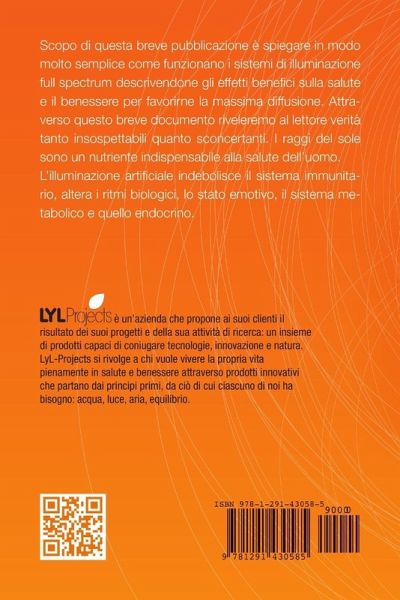 Finalmente un libro che con un linguaggio chiaro e semplice vi spiega cos'è la luce full spectrum e cosa può fare per la vostra salute e il vostro benessere. Scopo di questa breve pubblicazione è spiegare in modo molto semplice come funzionano i sistemi di illuminazione full spectrum descrivendone gli effetti benefici sulla salute e il benessere per favorirne la massima diffusione. Attraverso questo breve documento riveleremo al lettore verità tanto insospettabili quanto sconcertanti. I raggi del sole sono un nutriente indispensabile alla salute dell'uomo. L'illuminazione artificiale indebolisce il sistema immunitario, altera i ritmi biologici, lo stato emotivo, il sistema metabolico e quello endocrino.