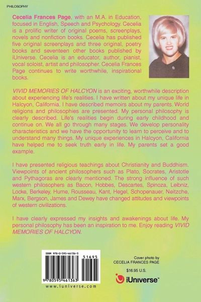 VIVID MEMORIES OF HALCYON is an exciting, worthwhile description about experiencing life's realities. I have written about my unique life in Halcyon, California. I have described memoirs about my parents. World religions and philosophies are presented. My personal philosophy is clearly described. Life's realities begin during early childhood and continue on. We all go through many stages. We develop personality characteristics and we have the opportunity to learn to perceive and to understand many things. My unique experiences in Halcyon, California have helped me to seek truth early in life. My parents set a good example. I have presented religious teachings about Christianity and Buddhism. Viewpoints of ancient philosophers such as Plato, Socrates, Aristotle and Pythagoras are clearly mentioned. The strong influence of such western philosophers as Bacon, Hobbes, Descartes, Spinoza, Leibniz, Locke, Berkeley, Hume, Rousseau, Kant, Hegel, Schopenauer, Neitzche, Marx, Bergson, James and Dewey have changed attitudes and viewpoints of western civilizations. I have clearly expressed my insights and awakenings about life. My personal philosophy has been an inspiration to me. Enjoy reading VIVID MEMORIES OF HALCYON.