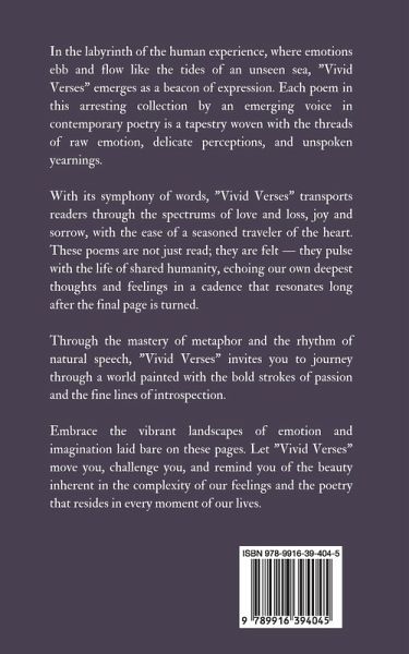 In the labyrinth of the human experience, where emotions ebb and flow like the tides of an unseen sea, "Vivid Verses" emerges as a beacon of expression. Each poem in this arresting collection by an emerging voice in contemporary poetry is a tapestry woven with the threads of raw emotion, delicate perceptions, and unspoken yearnings. With its symphony of words, "Vivid Verses" transports readers through the spectrums of love and loss, joy and sorrow, with the ease of a seasoned traveler of the heart. These poems are not just read; they are felt - they pulse with the life of shared humanity, echoing our own deepest thoughts and feelings in a cadence that resonates long after the final page is turned. Through the mastery of metaphor and the rhythm of natural speech, "Vivid Verses" invites you to journey through a world painted with the bold strokes of passion and the fine lines of introspection. Embrace the vibrant landscapes of emotion and imagination laid bare on these pages. Let "Vivid Verses" move you, challenge you, and remind you of the beauty inherent in the complexity of our feelings and the poetry that resides in every moment of our lives. © 2023 Book Fairy Publishing
