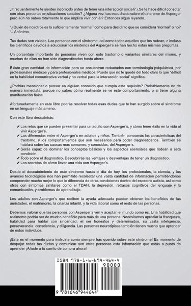 ¿Frecuentemente te sientes incómodo antes de tener una interacción social? ¿Se te hace difícil conectar con otras personas en situaciones sociales? ¿Alguna vez has escuchado sobre el síndrome de Asperger pero aún no sabes totalmente lo que implica vivir con él? Entonces sigue leyendo... "¿Quién de nosotros es lo suficientemente "normal" como para decidir lo que se considera "normal" o no? "- Anónimo. Tus dudas son válidas. Las personas con el síndrome, así como todos aquellos que los rodean, e incluso los científicos devotos a solucionar los misterios del Asperger's se han hecho estas mismas preguntas. Un porcentaje importante de personas viven con este trastorno o variantes similares del mismo, y muchas de ellas no han sido diagnosticadas hasta ahora. Existe gran cantidad de información pero se encuentran redactados con terminología psiquiátrica, por profesionales médicos y para profesionales médicos. Puede que no te quede del todo claro lo que "déficit en la habilidad comunicativa verbal y no verbal para la interacción social" significa. ¿Podrías mencionar o pensar en alguien conocido que cumpla este requisito? Probablemente no de manera inmediata, porque no sabes cómo realmente se ve este comportamiento, o si tiene alguna manifestación física. Afortunadamente en este libro podrás resolver todas esas dudas que te han surgido sobre el síndrome en un lenguaje más ameno. Con este libro descubrirás: Los retos que se pueden presentar para un adulto con Asperger's, y cómo tener éxito en la vida al vivir Asperger's. Las diferencias entre el Asperger's en adultos y niños. También conocerás las características del trastorno, y los comportamientos que son necesarios para poder diagnosticarlos. También se hablará sobre las causas más comunes, y conocidas, del Asperger's, Serás capaz de dominar los conceptos básicos y los aspectos esenciales que rodean a esta condición. Todo sobre el diagnostico. Descubrirás las ventajas y desventajas de tener un diagnóstico. Los secretos de cómo llevar una vida con Asperger's. Los adultos con Asperger's que reciben la ayuda adecuada pueden obtener los beneficios de las amistades, el matrimonio, la crianza infantil, y la vida laboral como el resto de las personas. Debemos valorar que las personas con Asperger's ven y aceptan el mundo como es. Una habilidad que realmente podría ser de mucho beneficio para más de una persona. Necesitamos apreciar la franqueza, habilidad para hablar con sinceridad, el ser honestos y determinados, su vasta inteligencia, perseverancia, consciencia, y diligencia. Las personas neurotípicas también tienen mucho que aprender de estos individuos. ¡Este es el momento para instruirte como siempre has querido sobre este síndrome! Es momento de despejar todas tus dudas y comunicar son otras personas esta información que estás a punto de aprender ¡Añade a tu carrito de compra ahora!