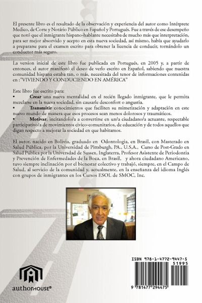 El presente libro es el resultado de la observación y experiencia del autor como Intérprete Medico, de Corte y Notário Público en Español y Portugués. Fue a través de ese desempeño que notó que el inmigrante hispano-hablante necesitaba de mucho más que interpretación, para ser mejor absorvido y acepto en esta nueva sociedad, así mismo, había que ayudarlo a prepararse para el examen escrito para obtener la licencia de conducir, tornándolo un conductor más seguro. La version inicial de este libro fue publicada en Portugués, en 2005 y, a partir de entonces, el autor manifestó el deseo de verlo escrito en Español, sabiendo que nuestra comunidad hispana estaba tan, o más, necesitada del tenor de informaciones contenidas en :"VIVIENDO Y CONDUCIENDO EN AMÉRICA" Este libro fue escrito para: ¿ Crear una nueva mentalidad en el recién llegado inmigrante, que le permita mezclarse en la nueva sociedad, sin causarle desconfort o angustia. ¿ Transmitir conocimientos que faciliten su mimetización y adaptación en este nuevo mundo de manera que esos procesos sean menos dolorosos y traumticos. ¿ Motivar, incitandolo/a a convertirse en un/a ciudadano/a actuante, respectable participativo/a de movimientos civico-comunitarios, de educación y de todos aquellos que digan respecto a mejorar la sociedad en que habitamos. El autor, nacido en Bolivia, graduado en Odontologia, en Brasil, con Masterado en Salud Pública, por la Universidad de Pittsburgh, PA., U.S,A., Curso de Pós-graduación en Salud Pública por la Universdad de Sussex, Inglaterra, Profesor Asistente de Periodontia y Prevención de Enfermedades de la Boca, en Brasil, y ahora ciudadano Americano, tuvo siempre inclinación por el bienestar colectivo y trabajó, siempre, en el Campo de Salud, al servicio de la comunidad y, actualmente, en la enseñanza del idioma Inglés con grupos de inmigrantes en los Cursos ESOL de SMOC, Inc.