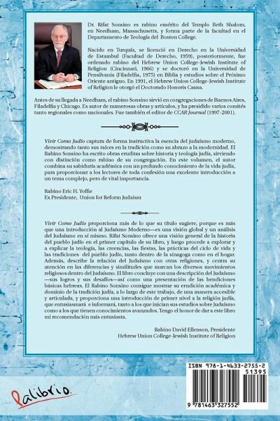 Vivir Como Judío captura de forma instructiva la esencia del judaísmo moderno, demostrando tanto sus raíces en la tradición como su abrazo a la modernidad. El Rabino Sonsino ha escrito obras eruditas sobre historia y teología judía, sirviendo con distinción como rabino de su congregación. En este volumen, el autor combina su sabiduría académica con un profundo conocimiento de la vida judía, para proporcionar a los lectores de toda confesión una excelente introducción a un tema complejo, pero de vital importancia. Rabino Eric H. Yoffie Ex Presidente, Union for Reform Judaism Vivir Como Judío proporciona más de lo que su título sugiere, porque es más que una introducción al Judaísmo Moderno-es una visión global y un análisis del Judaísmo en sí mismo. Rifat Sonsino ofrece una visión general de la historia del pueblo judío en el primer capítulo de su libro, y luego procede a explorar y a explicar la teología, las creencias, las fiestas, las prácticas del ciclo de vida y las tradiciones del pueblo judío, tanto dentro de la sinagoga como en el hogar. Además, describe la relación del Judaísmo con otras religiones, y centra su atención en las diferencias y similitudes que marcan los diversos movimientos religiosos dentro del Judaísmo. El libro concluye con una descripción del Judaísmo -sus logros y sus desafíos-así como una presentación de las bendiciones básicas hebreas. El Rabino Sonsino consigue mostrar su erudición académica y dominio de la tradición judía, a lo largo de este trabajo, de una manera accesible y articulada, y proporciona una introducción de primer nivel a la religión judía, que entusiasmará e informará, tanto a los que inician sus estudios sobre Judaísmo como a los que tienen conocimientos avanzados. Tengo el honor de dar a este libro mi recomendación más entusiasta. Rabino David Ellenson, Presidente Hebrew Union College-Jewish Institute of Religion