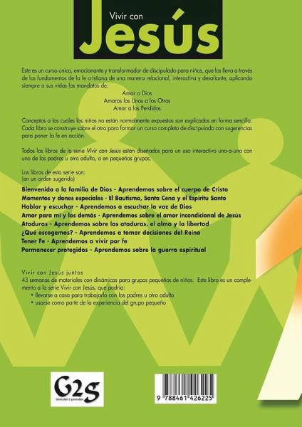 AMOR PARA MI Y LOS DEMÁS (quarto libro de la serie de ocho libros de VIVIR CON JESÚS) Este es un curso único, emocionante y transformador de discipulado para niños, que los lleva a través de los fundamentos de la fe cristiana de una manera relacional, interactiva y desafiante, aplicando siempre a sus vidas los mandas de: amar a Dios - amaros los unos los otros - amar a los perdidos. Conceptos a los cuales los niños no están normalmente expuestos son explicados en forma sencilla. Cada libro se construye sobre el otro para formar un curso completo de discipulado con sugerencias para poner la fe en acción. Todos los libros de la sirve VIVIR CON JESUS está diseñados para un su uso interactivo uno-a-uno con uno de los padres u otro adulto, o en pequeños grupos. Algunas iglesias lo usan en el contexto de le escuela dominical. Los libros de esta serie en orden sugerido son (en total son 43 semanas de material): - BIENVENIDOS A LA FAMILIA DE DIOS: Aprendemos sobre el cuerpo de Cristo - MOMENTOS Y DONES ESPECIALES: El bautismo, Santa Cena y el Espíritu Santo - HABLAR Y ESCUCHAR: Aprendemos a escuchar la voz de Dios - AMOR PARA MÍ Y LOS DEMÁS: Aprendemos sobre el amor incondicional de Jesús - ATADURAS: Aprendemos sobre las ataduras, el alma y la libertad - ¿QUÉ ESCOGEMOS?: Aprendemos a tomar decisiones del Reino - TENER FE: Aprendemos a vivir por fe - PERMANECER PROTEGIDOS: Aprendemos sobre la guerra espiritual Está pensado para niños de entre 6 - 11 años.