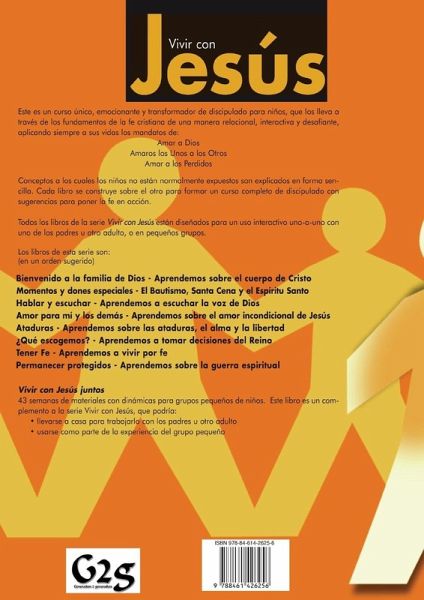 MOMENTOS Y DONES ESPECIALES (segundo libro de la serie de ocho libros de VIVIR CON JESÚS) Este es un curso único, emocionante y transformador de discipulado para niños, que los lleva a través de los fundamentos de la fe cristiana de una manera relacional, interactiva y desafiante, aplicando siempre a sus vidas los mandas de: amar a Dios - amaros los unos los otros - amar a los perdidos. Conceptos a los cuales los niños no están normalmente expuestos son explicados en forma sencilla. Cada libro se construye sobre el otro para formar un curso completo de discipulado con sugerencias para poner la fe en acción. Todos los libros de la sirve VIVIR CON JESUS está diseñados para un su uso interactivo uno-a-uno con uno de los padres u otro adulto, o en pequeños grupos. Algunas iglesias lo usan en el contexto de le escuela dominical. Los libros de esta serie en orden sugerido son (en total son 43 semanas de material): - BIENVENIDOS A LA FAMILIA DE DIOS: Aprendemos sobre el cuerpo de Cristo - MOMENTOS Y DONES ESPECIALES: El bautismo, Santa Cena y el Espíritu Santo - HABLAR Y ESCUCHAR: Aprendemos a escuchar la voz de Dios - AMOR PARA MÍ Y LOS DEMÁS: Aprendemos sobre el amor incondicional de Jesús - ATADURAS: Aprendemos sobre las ataduras, el alma y la libertad - ¿QUÉ ESCOGEMOS?: Aprendemos a tomar decisiones del Reino - TENER FE: Aprendemos a vivir por fe - PERMANECER PROTEGIDOS: Aprendemos sobre la guerra espiritual Está diseñado para niños de entre 6 - 11 años.