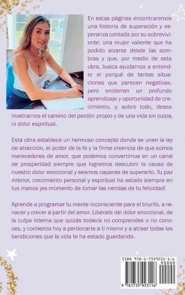 En estas páginas encontraremos una historia de superación y esperanza contada por su sobreviviente: una mujer valiente que ha podido alzarse desde las sombras y que, por medio de esta obra, busca ayudarnos a entender el porqué de tantas situaciones que parecen negativas, pero encierran un profundo aprendizaje y oportunidad de crecimiento, y, sobre todo, desea mostrarnos el camino del perdón propio y de una vida sin culpa, ni dolor espiritual. Esta obra establece un hermoso concepto donde se unen la ley de atracción, el poder de la fe y la firme creencia de que somos merecedores de amor, que podemos convertirnos en un canal de prosperidad siempre que logremos descubrir la causa de nuestro dolor emocional y seamos capaces de superarlo. Tu paz interior, crecimiento personal y espiritual ha estado siempre en tus manos ¡es momento de tomar las riendas de tu felicidad! Aprende a programar tu mente inconsciente para el triunfo, a renacer y crecer a partir del amor. Libérate del dolor emocional, de la culpa interna que quizás todavía no comprendes o no conoces, y comienza hoy a perdonarte a ti mismo y a atraer todas las bendiciones que la vida te ha estado guardando.