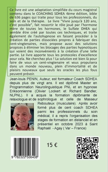 Ce livre est adapté du livre " le coaching SDHEA pour débutant" paru en langue française et dans cinq autres langues.Ce livre est lui-même une adaptation simplifiée du cours magistral contenu dans le COACHING SDHEA 4ème édition, bible de 636 pages qui traite pour tous les professionnels du soin et de la thérapie, de l'analyse des systèmes et de la gestion des émotions, de la gestion de l'excellence par la nutrition le sport des quatre piliers, la théorie de la beauté plastique avec le Hara de Dürkheim, du tantrisme de la main gauche et des techniques de mémorisation, de la parole thérapeutique et de la PNL, de la relaxation et de la Sophrologie et enfin de l'hypnose Eriksonnienne.Ce cours , adapté au livre "Vivre 120 ans, c'est possible", fait ressortir le rôle joué par l'hormone mère de toutes les hormones, le Sulfate DHEA qui semble être créé par toutes ces techniques, et traite également de la transe hypnotique adaptée à l'autohypnose en faisant procéder à la création de parties dissociées propres à fabriquer des cent-vingtenaires, mais propose aussi des comportements, des capacités et des valeurs propices à éliminer les blocages de parties hypnotiques qui voient des inconvénients à la création d'un telle partie. Le livre apporte tous les protocoles pour cela.Associé à de la relaxation et à de la Sophrologie , ce livre devrait permettre de régler tous les problèmes de stress et de déréglements de toutes sortes, y compris les problèmes de sommeil, qui empêchent d'atteindre cet objectif.Enfin, l'analyse des systèmes auquel le lecteur est formé, lui permet de dialoguer avec lui-même en discours basés sur la voie du milieu, technique la meilleure pour atteindre son inconscient le plus profond en permanence.Ne cherchez plus ! La solution est bien là pour faire de vous un cent-vingtenaire et vous propulser dans un monde nouveau plein d'immortalité et de plaisirs nouveaux que seuls les oracles les plus fous peuvent prévoir.