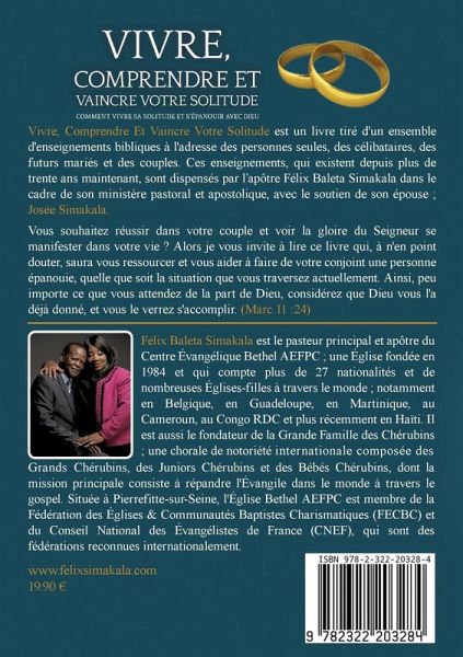 Vivre, Comprendre Et Vaincre Votre Solitude est un livre tiré d'un ensemble d'enseignements bibliques à l'adresse des personnes seules, des célibataires, des futurs mariés et des couples. Ces enseignements, qui existent depuis plus de trente ans maintenant, sont dispensés par l'apôtre Félix Baleta Simakala dans le cadre de son ministère pastoral et apostolique, avec le soutien de son épouse ; Josée Simakala. Ces enseignements visent à donner aux couples déjà établis les connaissances dont ils ont besoin pour s'épanouir pleinement dans leur mariage selon les ordonnances de Dieu le Père, mais aussi d'apporter aux célibataires et à ceux qui souhaitent s'engager dans les voies sacrées du mariage, toutes les armes spirituelles dont ils auront besoin pour réussir dans leur futur couple, voire dans leur vie de solitaire. Vous souhaitez réussir dans votre couple et voir la gloire du Seigneur se manifester dans votre vie? Alors je vous invite à lire ce livre qui, à n'en point douter, saura vous ressourcer et vous aider à faire de votre conjoint une personne épanouie, quelle que soit la situation que vous traversez actuellement. Ainsi, peu importe ce que vous attendez de la part de Dieu, considérez que Dieu vous l'a déjà donné, et vous le verrez s'accomplir. (Marc 11: 24)