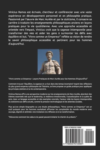 "Vivre comme un Empereur: Leçons pratiques de Marc Aurèle pour les hommes d'aujourd'hui" est une oeuvre qui se veut bien plus qu'une simple biographie ou une étude philosophique sur le dernier des Cinq Bons Empereurs de la Rome antique. Ce livre se distingue en tant que guide pratique visant à appliquer les enseignements et les principes stoïciens de Marc Aurèle à la vie moderne, en mettant un accent particulier sur le public masculin confronté à des défis dans un monde complexe et incertain. À travers un langage accessible et des exemples concrets, l'auteur explore des thèmes essentiels tels que l'autodiscipline, le leadership, la gestion émotionnelle et la quête d'un but dans la vie, tous inspirés des réflexions et des attitudes de l'empereur-philosophe. Le livre commence par une introduction aux concepts fondamentaux du stoïcisme, suivie d'histoires réelles de Marc Aurèle illustrant ces concepts en pratique. Ensuite, des stratégies spécifiques sont présentées pour permettre aux lecteurs d'intégrer ces enseignements dans leur quotidien. De plus, "Vivre comme un Empereur" offre une analyse critique des différences entre le contexte historique de Marc Aurèle et le monde contemporain, en proposant des adaptations des principes stoïciens pour aborder des enjeux actuels comme la surcharge technologique et les pressions sociales liées au succès et à l'image personnelle. Ce livre ne se contente pas de fournir une perspective approfondie sur la vie et la philosophie de Marc Aurèle; il outille également les lecteurs avec des idées pratiques pour surmonter les défis modernes avec dignité et sérénité. C'est une invitation à réfléchir sur des valeurs universelles qui transcendent le temps et les cultures, idéal pour les hommes à la recherche d'une inspiration historique afin de mener leur vie avec courage, sagesse et compassion.