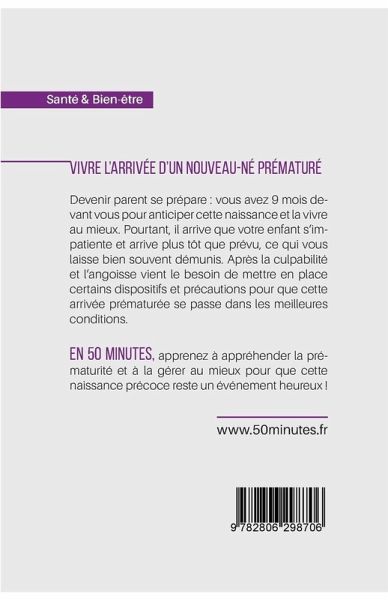 Découvrez tous nos conseils et astuces pour vivre sereinement une naissance prématurée ! Devenir parent se prépare : vous avez 9 mois devant vous pour anticiper cette naissance et la vivre au mieux. Pourtant, il arrive que votre enfant s'impatiente et arrive plus tôt que prévu, ce qui vous laisse bien souvent démunis. Après la culpabilité et l'angoisse vient le besoin de mettre en place certains dispositifs et précautions pour que cette arrivée prématurée se passe dans les meilleures conditions. Ce livre vous donnera des informations et des solutions pour : ¿ mieux comprendre la prématurité, ses causes et ses types ; ¿ appréhender ses potentielles complications ; ¿ vivre sereinement la naissance de votre enfant et son retour à la maison ; ¿ et bien plus encore ! Le mot de l'éditeur : « Dans ce numéro de la collection 50MINUTES Santé & Bien-être, Dominique van der Kaa nous permet de mieux comprendre ce qu'est la prématurité et ses causes. Faisant le tour de la question, le livre nous invite à faire le point sur les risques qu'encourent votre bébé, la prise en charge d'une naissance prématurée et le retour à la maison, afin que cette arrivée ne soit plus une source d'angoisse. » Laure Delacroix À PROPOS DE LA COLLECTION 50MINUTES Santé & Bien-être L'ambition de la collection 50MINUTES Santé & Bien-être est de proposer aux lecteurs des méthodes, des pistes et des conseils faciles à appliquer au quotidien pour aller vers un mieux-être. Nos livres s'adressent ainsi à toute personne désirant mieux gérer sa vie personnelle, et mieux appréhender les difficultés et obstacles qui peuvent se présenter à elle.