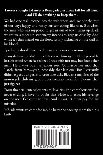I never thought I'd meet a Renegade, let alone fall for all four. And I'll do anything to keep them. We had one task: escape into the wilderness and live out the rest of our days happy and randy...or something like that. But when the man who was supposed to get us out of town turns up dead, we realize a more sinister enemy intends to keep us close by. And while it's their friend on the floor, it's my nickname on the wall in his blood. I probably should have told them my ex was an assassin. In my defense, I didn't think I'd ever see him again. Blade probably lost his mind when he realized I was with not one, but four other men. He always was the jealous sort. Or maybe he's mad that I stole from him-yeah, probably that last one. But I certainly didn't expect our paths to cross like this. Blade's a member of the motorcycle club my group does contract work for. Doesn't that just figure? From financial entanglements to loyalties, the complications feel never-ending. I have no doubt that Blade will exact his revenge on the men I've come to love. And I can't let them pay for my mistakes. If Blade wants to come for me, he better be packing more than his knife. The Claimed by Outlaws series is a high heat reverse harem MC romance that features one badass female con artist, her four alpha biker mates, and provocative MFMMM scenes. Why choose?