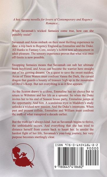 When Savannah's wicked fantasies come true, how can she possibly resist? Savannah and Arcas embark on their most thrilling experience to date: a trip back to Regency England as Emmaline and the Duke. All thanks to Fantasy Core, society's hottest new advancement in adult pleasure. The sensory experience proves that what was once off-limits is now possible. Swapping fantasies means that Savannah can nab her ultimate book boyfriend, and Arcas can become the warrior hero straight out of his gaming dreams. On a quest to save the sweet maiden, Arcas of Three Waters must confront Vanna the Dark, the cursed dragon that guards a bounty of treasure high up in the mountains of Devil's Keep. But not everything is as it first appears. As the Season draws to a close, Emmaline has no choice but to return to Wiltshire and her life as a spinster. So when the Duke invites her to his end of Season house party, Emmaline jumps at the opportunity. And him. A scandalous tryst in Maddern's study unlocks a wicked new passion. And the Duke's intentions. When past and present collide, Emmaline and William must confront the truth of what transpired a decade earlier. But the truth isn't always kind. Just as Savannah begins to thrive, the unthinkable occurs. And everything that she has tried to distance herself from comes back to haunt her. In amidst the hardest fight of her life, Savannah's year-long journey, her very purpose becomes startlingly clear. As fantasy and reality collide, Savannah must find the courage to save herself and any chance of a future with Arcas, before it is too late.