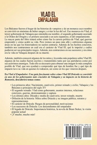 Si desea descubrir la fascinante historia de Vlad el Empalador siga leyendo... Los Balcanes fueron el hogar de las historias de vampiros y de un monarca cuyo nombre se convirtió en sinónimo de beber sangre y evitar la luz del sol. Ese monarca era Vlad, el tercer gobernante de Valaquia que ostentaba ese nombre, el segundo gobernante asociado a la Orden del Dragón y el primero asociado a un acto espantoso, el del empalamiento. La mayor parte del libro tratará sobre cómo fue la carrera política de Vlad, qué guerras emprendió y cómo acabó su vida. Pero iremos un paso más allá y cubriremos algunas áreas en las que los historiadores no suelen centrarse. Además de los hechos concretos, también nos centraremos en cuál era el carácter de Vlad III, qué le impulsó y cuáles pudieron ser sus principales rasgos. Además, nos centraremos en sus sucesores y en cómo era la vida en Valaquia después de su muerte. Además, también conocerá algunos de los mitos y leyendas más populares sobre Vlad III, algunos de los cuales fueron escritos y transmitidos tanto por sus partidarios como por sus acérrimos enemigos. Todo ello es necesario para obtener una imagen lo más completa posible de Vlad, que nos ayudará a comprender qué tipo de hombre fue y qué tipo de impacto tuvo su vida en quienes le rodearon, así como en los que vinieron después. En Vlad el Empalador: Una guía fascinante sobre cómo Vlad III Drácula se convirtió en uno de los gobernantes más cruciales de Valaquia y su impacto en la historia de Rumanía, descubrirá temas como:Los primeros años: Nacimiento, cautiverio, primer reinado y exilio; Valaquia y los Balcanes a principios del siglo XV El segundo reinado: Vlad como gobernante, asuntos internos, relaciones exteriores, guerras, destronamiento y captura Los últimos años: Década y media de cautiverio, tercer reinado, muerte Difusión de la historia: Mitos sobre Drácula y su imagen pública, retratos y representaciones El carácter de Drácula: Rasgos de personalidad, motivaciones Los sucesores de Drácula: Los descendientes del empalador El legado de Drácula: Importancia histórica, la novela de Bram Stoker, la visión popular actual ¡Y mucho, mucho más! ¡Adquiera este libro ahora para saber más!