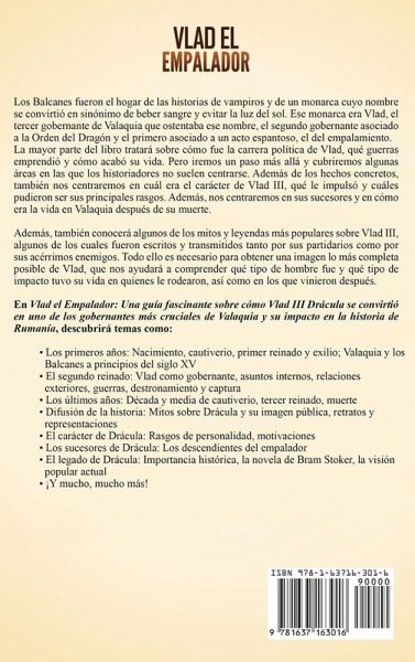 Si desea descubrir la fascinante historia de Vlad el Empalador siga leyendo... Los Balcanes fueron el hogar de las historias de vampiros y de un monarca cuyo nombre se convirtió en sinónimo de beber sangre y evitar la luz del sol. Ese monarca era Vlad, el tercer gobernante de Valaquia que ostentaba ese nombre, el segundo gobernante asociado a la Orden del Dragón y el primero asociado a un acto espantoso, el del empalamiento. La mayor parte del libro tratará sobre cómo fue la carrera política de Vlad, qué guerras emprendió y cómo acabó su vida. Pero iremos un paso más allá y cubriremos algunas áreas en las que los historiadores no suelen centrarse. Además de los hechos concretos, también nos centraremos en cuál era el carácter de Vlad III, qué le impulsó y cuáles pudieron ser sus principales rasgos. Además, nos centraremos en sus sucesores y en cómo era la vida en Valaquia después de su muerte. Además, también conocerá algunos de los mitos y leyendas más populares sobre Vlad III, algunos de los cuales fueron escritos y transmitidos tanto por sus partidarios como por sus acérrimos enemigos. Todo ello es necesario para obtener una imagen lo más completa posible de Vlad, que nos ayudará a comprender qué tipo de hombre fue y qué tipo de impacto tuvo su vida en quienes le rodearon, así como en los que vinieron después. En Vlad el Empalador: Una guía fascinante sobre cómo Vlad III Drácula se convirtió en uno de los gobernantes más cruciales de Valaquia y su impacto en la historia de Rumanía, descubrirá temas como:Los primeros años: Nacimiento, cautiverio, primer reinado y exilio; Valaquia y los Balcanes a principios del siglo XV El segundo reinado: Vlad como gobernante, asuntos internos, relaciones exteriores, guerras, destronamiento y captura Los últimos años: Década y media de cautiverio, tercer reinado, muerte Difusión de la historia: Mitos sobre Drácula y su imagen pública, retratos y representaciones El carácter de Drácula: Rasgos de personalidad, motivaciones Los sucesores de Drácula: Los descendientes del empalador El legado de Drácula: Importancia histórica, la novela de Bram Stoker, la visión popular actual ¡Y mucho, mucho más! ¡Adquiera este libro ahora para saber más!
