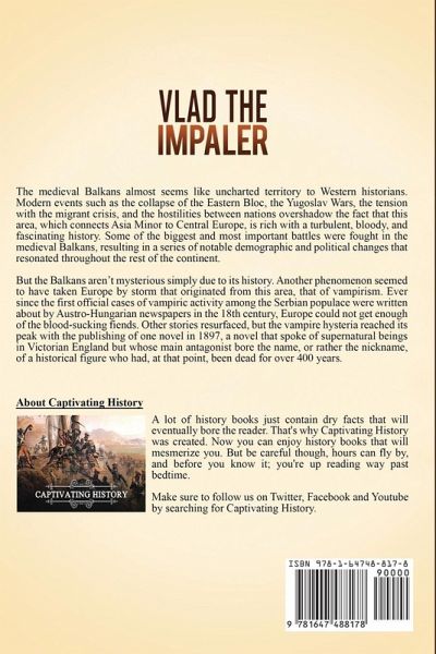 If you want to discover the captivating history of Vlad the Impaler, then keep reading... The Balkans were the home of both the vampiric stories and a monarch, whose name became synonymous with drinking blood and avoiding sunlight. That monarch was Vlad, the third ruler of Wallachia to hold that name, the second ruler to be associated with the Order of the Dragon, and the first ruler to be associated with a gruesome act, that of impalement. The bulk of the book will deal with what Vlad's political career looked like, what wars he waged, and how his life eventually ended. But we'll go one step beyond and cover some areas that historians don't typically focus on. In addition to raw facts, we'll also focus on what Vlad III's character was, what drove him forward, and what his chief traits might have been. In addition, we will give a much-needed focus on his successors and what life was like in Wallachia after his passing. Furthermore, you'll also get a glimpse into some of the most popular myths and legends about Vlad III, some of which were written and passed on by both his supporters and his bitter enemies. All of these are needed to get as complete an image of Vlad as possible, which will help us understand what kind of man he was and what kind of impact his life had on those around him, as well as those who came after him. In Vlad the Impaler: A Captivating Guide to How Vlad III Dracula Became One of the Most Crucial Rulers of Wallachia and His Impact on the History of Romania, you will discover topics such asEarly Years: Birth, Captivity, First Reign, and Exile; Wallachia and the Balkans in the Early 15th Century Second Reign: Vlad as a Ruler, Domestic Affairs, Foreign Relations, Wars, Dethroning, and Capture Final Years: A Decade and a Half of Captivity, Third Reign, Death Spreading the Story: Myths about Dracula and His Public Image, Portraits, and Depictions The Character of Dracula: Personality Traits, Motivations Dracula's Successors: Descendants of the Impaler Legacy of Dracula: Historical Importance, Bram Stoker's Novel, Popular View Today And much, much more! So if you want to learn more about Vlad the Impaler, scroll up and click the "add to cart" button!