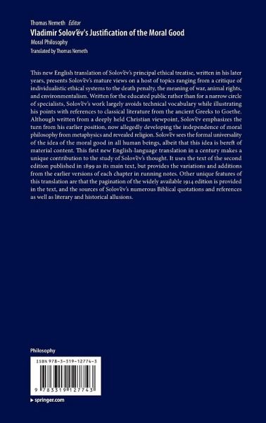 This new English translation of Solov'ëv's principal ethical treatise, written in his later years, presents Solov'ëv's mature views on a host of topics ranging from a critique of individualistic ethical systems to the death penalty, the meaning of war, animal rights, and environmentalism. Written for the educated public rather than for a narrow circle of specialists, Solov'ëv's work largely avoids technical vocabulary while illustrating his points with references to classical literature from the ancient Greeks to Goethe. Although written from a deeply held Christian viewpoint, Solov'ëv emphasizes the turn from his earlier position, now allegedly developing the independence of moral philosophy from metaphysics and revealed religion. Solov'ëv sees the formal universality of the idea of the moral good in all human beings, albeit that this idea is bereft of material content. This first new English-language translation in a century makes a unique contribution to the study of Solov'ëv's thought. It uses the text of the second edition published in 1899 as its main text, but provides the variations and additions from the earlier versions of each chapter in running notes. Other unique features of this translation are that the pagination of the widely available 1914 edition is provided in the text, and the sources of Solov'ëv's numerous Biblical quotations and references as well as literary and historical allusions.