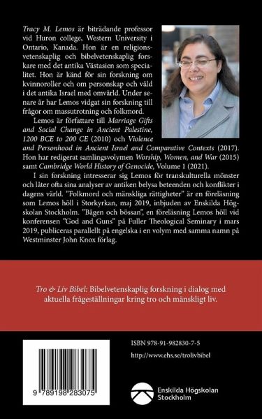 Våld och vapen i Bibelns värld och vår innehåller två essäer av den amerikanska religionsvetaren Tracy M. Lemos. Den första texten, Folkmord och mänskliga rättigheter: Vad Bibeln berättar och inte, är en offentlig föreläsning som Lemos höll i Storkyrkan, Stockholm, i maj 2019. Den andra texten, Bågen och bössan: Skjutvapen som maskulinitetssymbol i antikens Israel och dagens Amerika, är en föreläsning från Fuller Theological Seminary. De två essäerna behandlar frågor om våld och personskap, om krig och vapen, om massutrotning och mänskliga rättigheter.