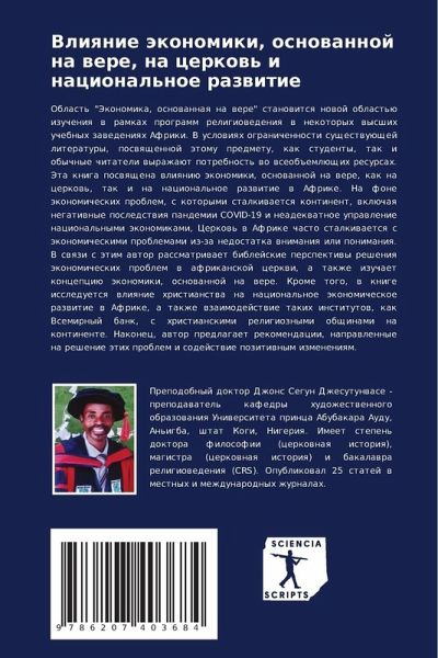 Oblast' "Jekonomika, osnowannaq na were" stanowitsq nowoj oblast'ü izucheniq w ramkah programm religiowedeniq w nekotoryh wysshih uchebnyh zawedeniqh Afriki. V uslowiqh ogranichennosti suschestwuüschej literatury, poswqschennoj ätomu predmetu, kak studenty, tak i obychnye chitateli wyrazhaüt potrebnost' wo wseob#emlüschih resursah. Jeta kniga poswqschena wliqniü äkonomiki, osnowannoj na were, kak na cerkow', tak i na nacional'noe razwitie w Afrike. Na fone äkonomicheskih problem, s kotorymi stalkiwaetsq kontinent, wklüchaq negatiwnye posledstwiq pandemii COVID-19 i neadekwatnoe uprawlenie nacional'nymi äkonomikami, Cerkow' w Afrike chasto stalkiwaetsq s äkonomicheskimi problemami iz-za nedostatka wnimaniq ili ponimaniq. V swqzi s ätim awtor rassmatriwaet biblejskie perspektiwy resheniq äkonomicheskih problem w afrikanskoj cerkwi, a takzhe izuchaet koncepciü äkonomiki, osnowannoj na were. Krome togo, w knige issleduetsq wliqnie hristianstwa na nacional'noe äkonomicheskoe razwitie w Afrike, a takzhe wzaimodejstwie takih institutow, kak Vsemirnyj bank, s hristianskimi religioznymi obschinami na kontinente. Nakonec, awtor predlagaet rekomendacii, naprawlennye na reshenie ätih problem i sodejstwie pozitiwnym izmeneniqm.