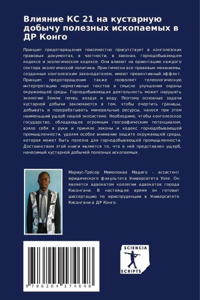 Princip predotwrascheniq powsemestno prisutstwuet w kongolezskih prawowyh dokumentah, w chastnosti, w zakonah, gornodobywaüschem kodexe i äkologicheskom kodexe. Oni wliqüt na orientaciü kazhdogo sektora äkologicheskoj politiki. Prakticheski wse prawowye mehanizmy, sozdannye kongolezskim zakonodatelem, imeüt prewentiwnyj äffekt. Princip predotwrascheniq takzhe pozwolqet teleologicheskuü interpretaciü normatiwnyh textow w smysle uluchsheniq ohrany okruzhaüschej sredy. Gornodobywaüschaq deqtel'nost' mozhet narushit' äkologiü Zemli: pochwu, wozduh i wodu. Poätomu osnownye zadachi kustarnoj dobychi zaklüchaütsq w tom, chtoby ochertit' granicy, dobywat' i pererabatywat' mineral'nye resursy, nanosq pri ätom naimen'shij uscherb nashej äkosisteme. Neobhodimo, chtoby kongolezskoe gosudarstwo, obladaüschee ogromnym geograficheskim potencialom, wzqlo sebq w ruki i prinqlo zakony i kodex gornodobywaüschej promyshlennosti, udelqq osoboe wnimanie zaschite okruzhaüschej sredy, kotoraq mozhet byt' polezna dlq gornodobywaüschej promyshlennosti. Dostoinstwom ätoj knigi qwlqetsq to, chto w nej predstawlen uscherb, nanosimyj kustarnoj dobychej poleznyh iskopaemyh.