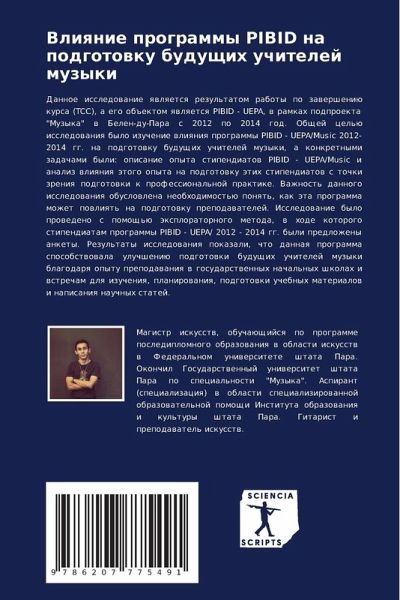 Dannoe issledowanie qwlqetsq rezul'tatom raboty po zawersheniü kursa (TCC), a ego ob#ektom qwlqetsq PIBID - UEPA, w ramkah podproekta "Muzyka" w Belen-du-Para s 2012 po 2014 god. Obschej cel'ü issledowaniq bylo izuchenie wliqniq programmy PIBID - UEPA/Music 2012-2014 gg. na podgotowku buduschih uchitelej muzyki, a konkretnymi zadachami byli: opisanie opyta stipendiatow PIBID - UEPA/Music i analiz wliqniq ätogo opyta na podgotowku ätih stipendiatow s tochki zreniq podgotowki k professional'noj praktike. Vazhnost' dannogo issledowaniq obuslowlena neobhodimost'ü ponqt', kak äta programma mozhet powliqt' na podgotowku prepodawatelej. Issledowanie bylo prowedeno s pomosch'ü äxploratornogo metoda, w hode kotorogo stipendiatam programmy PIBID - UEPA/ 2012 - 2014 gg. byli predlozheny ankety. Rezul'taty issledowaniq pokazali, chto dannaq programma sposobstwowala uluchsheniü podgotowki buduschih uchitelej muzyki blagodarq opytu prepodawaniq w gosudarstwennyh nachal'nyh shkolah i wstrecham dlq izucheniq, planirowaniq, podgotowki uchebnyh materialow i napisaniq nauchnyh statej.