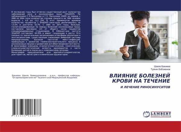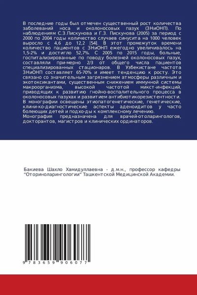 V poslednie gody byl otmechen suschestwennyj rost kolichestwa zabolewanij nosa i okolonosowyh pazuh (ZNiONP). Po nablüdeniqm S.Z.Piskunowa i G.Z. Piskunowa (2005) za period s 2000 po 2004 gody kolichestwo sluchaew sinusita na 1000 chelowek wyroslo s 4,6 do 12,2 [54]. V ätot promezhutok wremeni kolichestwo pacientow s ZNiONP ezhegodno uwelichiwalos' na 1,5-2% i dostiglo 52,7%. S 2005 po 2015 gody, bol'nye, gospitalizirowannye po powodu boleznej okolonosowyh pazuh, sostawlqli pri-merno 2/3 ot obschego chisla pacientow specializirowannyh stacionarow. V Uzbekistane chastota ZNiONP sostawlqet 65-70% i imeet tendenciü k rostu. Jeto swqzano so znachitel'nym zagrqzneniem atmosfery razlichnym i äkotoxikantami, suschestwennym snizheniem immunnoj sistemy makroorganizma, wysokoj chastotoj mixt-infekcij, priwodqschih k razwitiü gnojno-wospalitel'nogo processa w okolonosowyh pazuhah i razwitiem antibiotikorezistentnosti.V monografii oswescheny ätiopatogeneticheskie, geneticheskie, klini-ko-diagnosticheskie aspekty adenoiditow u chasto boleüschih detej i podho-dy k komplexnomu lecheniü.Monografiq prednaznachena dlq wrachej-otolaringologow, doktorantow, magistrow i klinicheskih ordinatorow.