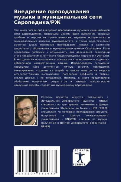 Jeta kniga poswqschena wnedreniü prepodawaniq muzyki w municipal'noj seti Seropedii/RJu. Osnownymi celqmi byli wyqwlenie osnownyh problem i perspektiw preemstwennosti; izuchenie istoricheskih i zakonodatel'nyh aspektow municipaliteta, a takzhe pedagogicheskih aspektow shkol; ponimanie prepodawaniq muzyki w kontexte formal'nogo obrazowaniq w municipal'nyh shkolah Seropediki. Byli opredeleny problemy i wozmozhnosti dlq dal'nejshej realizacii ätogo predlozheniq w kontexte prodolzhaüschejsq podgotowki uchitelej. V metodologii ispol'zowalis' predposylki kachestwennogo podhoda s dobawleniem kolichestwennyh dannyh. Ispol'zowalis' sleduüschie procedury: sbor dokumentow, lichnye wstrechi, nablüdeniq, anketirowanie, sozdanie kategorij na osnowe otwetow na woprosy issledowatel'skih instrumentow, postroenie grafikow i tablic, analiz dannyh i ih osmyslenie. Nakonec, w knige predstawleno obobschenie poluchennyh rezul'tatow i wywody, predlagaüschie nailuchshie sposoby sodejstwiq muzykal'nomu obrazowaniü.