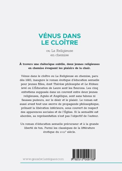 À travers une rhétorique subtile, deux jeunes religieuses en chemise évoquent les plaisirs de la chair. POUR UN PUBLIC AVERTI. Vénus dans le cloître ou La Religieuse en chemise, paru dès 1683, inaugure le roman érotique d'éducation sexuelle pour jeunes filles, dont Thérèse philosophe et Le Rideau levé ou L'Éducation de Laure sont les fleurons. Les cinq entretiens supposés dans un couvent entre deux jeunes religieuses, Agnès et Angélique, sont sans tabous ni fausses pudeurs, sur le désir et le plaisir. Le roman est aussi avant tout une ¿uvre de propagande philosophique, prônant la libération intérieure, sous couvert de respect des apparences sociales et de l'Église. Si la sexualité est abordée, sa représentation n'est pas l'objectif de l'auteur. Un roman d'éducation sexuelle précurseur et à la grande liberté de ton. Parmi les classiques de la littérature érotique du XVIIIe siècle. EXTRAIT Agnès. ¿ Ah Dieu ! s¿ur Angélique, n¿entrez pas dans ma chambre ; je ne suis pas visible à présent. Faut-il ainsi surprendre les personnes dans l¿état où je suis ? Je croyais avoir bien fermé la porte. Angélique. ¿ Eh bien ! Tout doucement ; qüas-tu à t¿alarmer ? Le grand mal de t¿avoir trouvée changeant de chemise, ou faisant autre chose de mieux ! Les bonnes amies ne se doivent aucunement cacher les unes aux autres. Assieds-toi sur ta couche comme tu étais, je vais fermer la porte sur nous. Agnès. ¿ Je vous assure, ma s¿ur, que je mourrais de confusion si une autre que vous m¿avait ainsi surprise ; mais je suis certaine que vous avez beaucoup d¿affection pour moi, c¿est pourquoi je n¿ai pas sujet de rien craindre de vous, quelque chose que vous eussiez pu voir. Angélique. ¿ Tu as raison, mon enfant, de parler de la sorte ; et quand je n¿aurais pas pour toi toute la tendresse qüun c¿ur peut ressentir, tu devrais toujours avoir l¿esprit en repos de ce côté-là. Il y a sept ans que je suis religieuse ; je suis entrée dans le cloître à treize, et je puis dire que je ne me suis point encore fait d¿ennemies par ma mauvaise conduite, ayant toujours eu la médisance en horreur, et ne faisant rien plus au gré de mon c¿ur que lorsque je rends service à quelques-unes de la communauté. C¿est cette manière d¿agir qui m¿a procuré l¿affection de la plupart, et qui m¿a surtout assuré celle de notre supérieure, qui ne m¿est pas d¿un petit usage dans l¿occasion. À PROPOS DE L'AUTEUR Abbé du Prat est un pseudonyme attribué à l'abbé Jean Barrin ou François de Chavigny de La Bretonnière, pour l'écriture et la publication des entretiens de Vénus dans le cloître ou La Religieuse en chemise. À PROPOS DE LA COLLECTION Retrouvez les plus grands noms de la littérature érotique dans notre collection Grands classiques érotiques. Autrefois poussés à la clandestinité et relégués dans « l'Enfer des bibliothèques », les auteurs de ces ¿uvres incontournables du genre sont aujourd'hui reconnus mondialement. Du Marquis de Sade à Alphonse Momas et ses multiples pseudonymes, en passant par le lyrique Alfred de Musset ou la féministe Renée Dunan, les Grands classiques érotiques proposent un catalogue complet et varié qui contentera tant les novices que les connaisseurs.