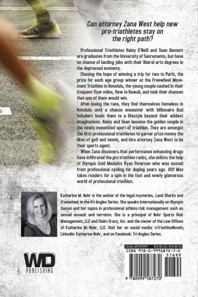 In VO2 Max, the third installment of Katharine Nohr's legal mystery sports fiction series set in Honolulu, Hawaii, attorneys Zana West's and Jerry Hirano's relationship is at risk when new challenges develop as Zana takes on a new career track as a sports agent. Will their love survive all the changes? And can Zana help new pro-triathletes, Haley O'Neill and Sean Bennett, stay on the right path? Professional Triathletes Haley O'Neill and Sean Bennett are graduates from the University of Sacramento, but have no chance of landing jobs with their liberal arts degrees in the depressed economy. Chasing the hope of winning a trip for two to Paris, the prize for each age group winner at the Freewheel Movement Triathlon in Honolulu, the young couple cashed in their frequent flyer miles, flew to Hawaii, and took their chances that one of them would win. After losing the race, they find themselves homeless in Honolulu until a chance encounter with billionaire Bud Schubert leads them to a lifestyle beyond their wildest imaginations. Haley and Sean become the golden couple in the newly monetized sport of triathlon. They are amongst the first professional triathletes to garner prize money the likes of golf and tennis, and hire attorney Zana West to be their sports agent. When Zana discovers that performance enhancing drugs have infiltrated the pro triathlon ranks, she enlists the help of Olympic Gold Medalist Ryan Peterson who was ousted from professional cycling for doping years ago. VO2 Max takes readers for a spin in the fast and newly glamorous world of professional triathlon.