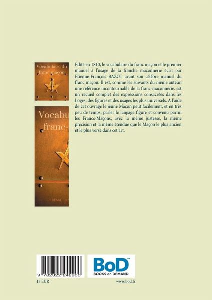 Edité en 1810, le vocabulaire du franc maçon et le premier manuel à l'usage de la franche maçonnerie écrit par Etienne-François BAZOT avant son célèbre manuel du franc maçon. Il est, comme les suivants du même auteur, une référence incontournable de la franc-maçonnerie. est un recueil complet des expressions consacrées dans les Loges, des figures et des usages les plus universels. A l'aide de cet ouvrage le jeune Maçon peut facilement, et en très peu de temps, parler le langage figuré et convenu parmi les Francs-Maçons, avec la même justesse, la même précision et la même étendue que le Maçon le plus ancien et le plus versé dans cet art. Les Maçons y trouveront également les préceptes généraux, les principes qui doivent leur servir de guide et former leur règle invariable ; enfin, les lois réglementaires ou d'administration intérieure qu'il ne leur est pas permis d'ignorer ni d'enfreindre.