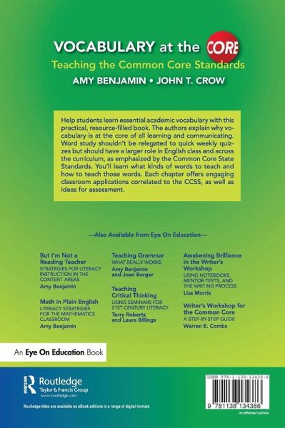 Vocabulary at the Core, the expanded and updated edition of Vocabulary at the Center ((c) 2009), is the definitive guide for every teacher engaged in helping students learn essential academic vocabulary. In clear, precise language, Benjamin and Crow explain why vocabulary is at the core of all learning and communicating and why word study should play a more significant role in English class and across the curriculum-as emphasized by the Common Core State Standards. You will learn... How words get learned and stay learned. Why teachers must emphasize useful academic words. Why rote memorization doesn't work and why students need opportunities for deep processing. How and why to teach derivations, collocations, register, idioms, and gender. How and why to teach context clues, fluency, and pronunciation. The benefits of graphic organizers and word games in the classroom. Each chapter includes engaging, easy-to-implement classroom applications that are correlated to the Common Core State Standards and will fit seamlessly into your lesson plans. BONUS! Vocabulary at the Core also provides ideas for formative and summative assessments.
