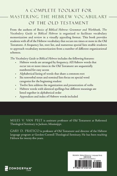 A Hebrew vocabulary guide that gives the student everything he or she needs in order to master basic Hebrew vocabulary and to expand knowledge of biblical Hebrew.