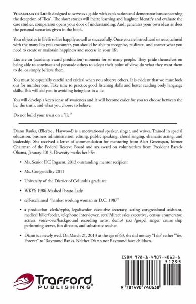 Vocabulary of Lies is designed to serve as a guide with explanation and demonstrations concerning the deception of "lies". The short stories will incite learning and laughing. Identify and evaluate the case studies; comparison opens your door of understanding. And generate your own ideas from the personal scenarios given in the book. I know your objective in life is to live happily as well as successfully. Once you are introduced or reacquainted with the many lies you encounter, you should be able to recognize, redirect, and correct what you need to create or maintain happiness and success in your life. Lies are an Academy-award production moment for so many people. They pride themselves on being able to convince and persuade others to adopt their point of view, do what they want them to do, or simply believe them. You must be especially careful and critical when you observe others. It is evident that we must look out for number 1. If you do not take the time to practice good listening and body-language reading skills, just to name a few, you may become lost in a lie. You will develop a keen sense of awareness, and it will become easier for you to choose between the lie, the truth, and what you choose to believe. We need one another; therefore, let's not build our trust on a "lie".