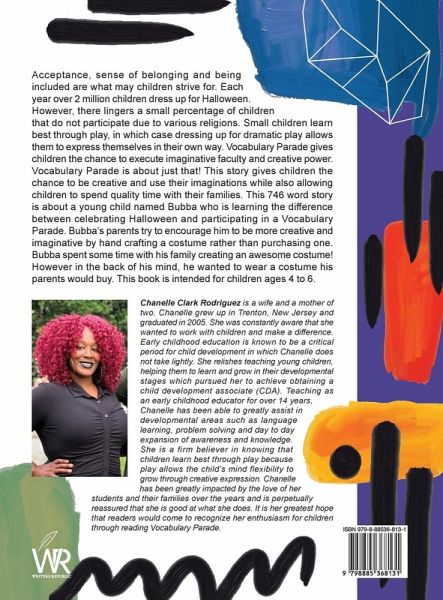 Acceptance, sense of belonging and being included are what may children strive for. Each year over 2 million children dress up for Halloween.However, there lingers a small percentage of children that do not participate due to various religions. Small children learn best through play, in which case dressing up for dramatic play allows them to express themselves in their own way. Vocabulary Parade gives children the chance to execute imaginative faculty and creative power. Vocabulary Parade is about just that! This story gives children the chance to be creative and use their imaginations while also allowing children to spend quality time with their families. This 746 word story is about a young child named Bubba who is learning the difference between celebrating Halloween and participating in a Vocabulary Parade. Bubba's parents try to encourage him to be more creative and imaginative by hand crafting a costume rather than purchasing one. Bubba spent some time with his family creating an awesome costume!However in the back of his mind, he wanted to wear a costume his parents would buy. This book is intended for children ages 4 to 6.
