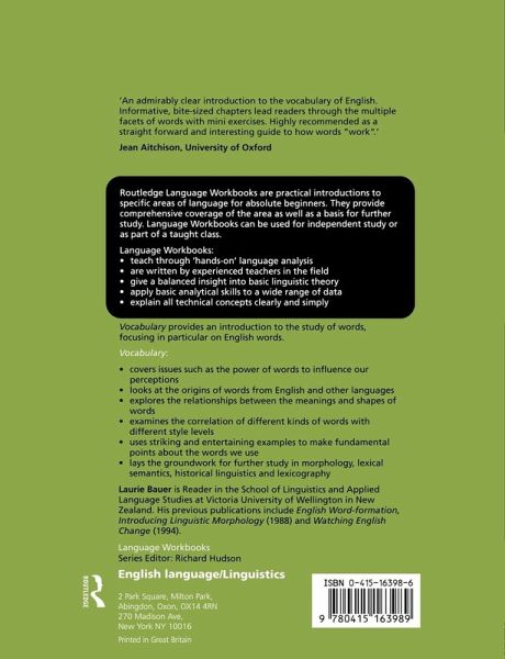 Routledge Language Workbooks are practical introductions to specific areas of language for absolute beginners. They provide comprehensive coverage of the area as well as a basis for further study. Language Workbooks can be used for independent study or as part of a taught class. Vocabulary: * covers issues such as the power of words to influence our perceptions * looks at the origins of words from English and other languages * explores the relationships between the meanings and shapes of words * examines the correlation of different kinds of words with different style levels * uses striking and entertaining examples to make fundamental points about the words we use * lays the groundwork for further study in morphology, lexical semantics, historical linguistics and lexicography.