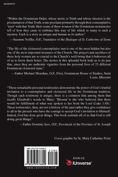 "Within the Dominican Order, whose motto is Truth and whose mission is the proclamation of that Truth, some proclaim primarily through their contemplative 'tryst' with that Truth. Here some of these women of the Dominican monasteries tell of how they came to embrace this way of life which to many is such a mystery. Each is a story as unique and human as its author." -Suzanne Noffke, O.P., Translator of the Dialogue of St. Catherine of Siena "The life of the cloistered contemplative nun is one of the most hidden but also one of the most important treasures of the Church. The prayers and sacrifices of these holy women are so crucial to the Church's well-being that it behooves all of us to know them better. The stories in this splendid book help us to do just that, since they are authentic vignettes from the personal lives of 23 different Dominican cloistered nuns." -Father Michael Monshau, O.P., Prior, Dominican House of Studies, Saint Louis, Missouri "These remarkable personal testimonies demonstrate the power of God's fruitful invitation to a contemplative and cloistered life in the Dominican tradition. Though each testimony is unique, there is a common link among them that recalls Elizabeth's words to Mary: 'Blessed is she who believed that there would be fulfillment of what was spoken to her from the Lord (Luke 1:45).' These testimonies, then, are not a history of the past rather they give confidence to all in the present who have the courage to accept God's invitation to Himself. Indeed, God has done great things. This book reminds all of us that God is still doing great things." -Father Dominic Izzo, O.P., Provincial of the Province of St. Joseph