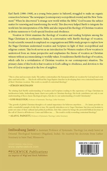 Karl Barth (1886-1968), as a young Swiss pastor in Safenwil, struggled to make an organic connection between ""the newspaper [contemporary sociopolitical events] and the New Testament."" When he discovered ""a strange new world of God within the Bible,"" God became the subject matter for renewing and transforming the world. This discovery helped Barth to integrate the world into his interpretation of the Bible and also impacted his theology of Christian vocation as divine summons to God's special freedom and obedience. Vocation in Christ examines the theology of vocation and reading Scripture among the Naga Christians in northeastern India, in conversation with Barth's theology of vocation. Social-scientific research is employed on congregations and Bible study groups to explore how the Naga Christians understand vocation and Scripture in light of their sociopolitical and religious context. This book serves as an introduction for Western readers of how vocation is understood from an Asian perspective and emphasizes the theme of vocation as Christian witness without accommodating to worldly values. It readdresses Barth's theology of vocation, which calls for a revitalization of Christian vocation in our contemporary situation. The primary claim of this book is that vocation is God's calling to obedience, and devotion to the love of God is reciprocal to the love of neighbor. ""This is a fine and necessary study. The author contextualizes the European debate on vocation by God and one's own place and task in life. . . . This book will lead the Naga Baptist churches in developing their own contextual framework of their Christian vocation. This work is a model of contextual theology."" --Jurgen Moltmann ""By relating Karl Barth's understanding of vocation and Scripture reading to the experience of Naga Christians in northeastern India, Imliwabang Jamir charts new paths in Christian theology. His book contributes not only to our understanding of these classic theological topics, but also to our understanding of world Christianity."" --Lois Malcolm, Professor of Systematic Theology, Luther Seminary ""The growth of global Christian thought is of central importance for believers anywhere. . . . Dr. Jamir provides us with a wonderful example of why this is true. He expertly introduces us to Naga Christians, but does not hesitate to point out some of their cultural and political problems. Into this context he brings the powerful biblical doctrine of the call of Christ to all believers: Come and follow me. . . . The result is richly rewarding contextual theology."" --Alan G. Padgett, Professor of Systematic Theology, Luther Seminary Imliwabang Jamir is Assistant Professor of Systematic Theology (on study leave) at Oriental Theological Seminary (Nagaland, India). He received his doctorate from Luther Seminary in Saint Paul, Minnesota.