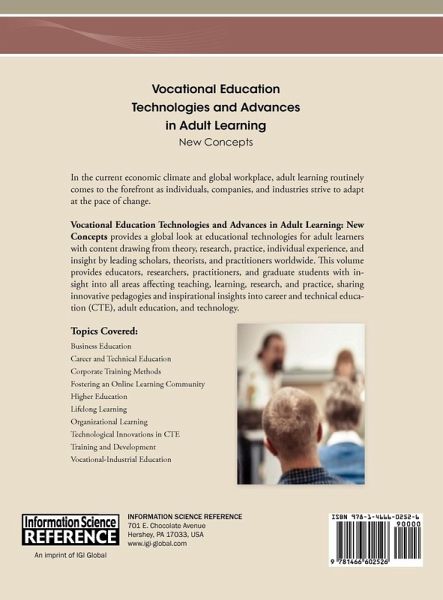 In the current economic climate and global workplace, adult learning routinely comes to the forefront as individuals, companies, and industries strive to adapt at the pace of change. Vocational Education Technologies and Advances in Adult Learning: New Concepts provides a global look at educational technologies for adult learners with content drawing from theory, research, practice, individual experience, and insight by leading scholars, theorists, and practitioners worldwide. This volume provides educators, researchers, practitioners, and graduate students with insight into all areas affecting teaching, learning, research, and practice, sharing innovative pedagogies and inspirational insights into career and technical education (CTE), adult education, and technology.